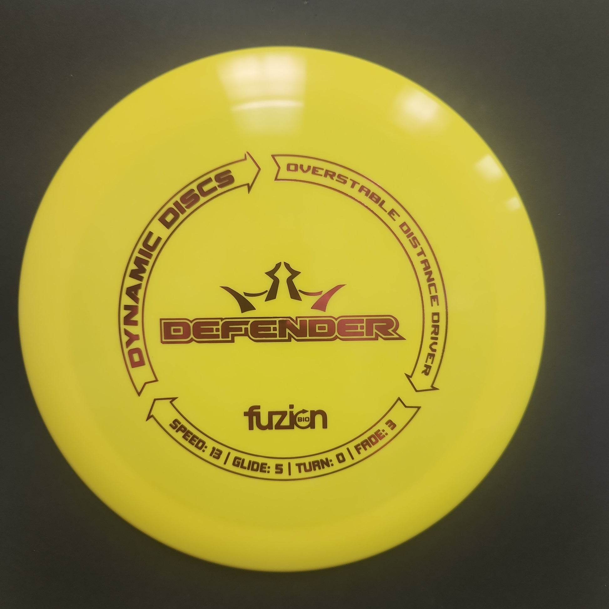 Dynamic Discs' Defender is a super-fast overstable driver with a big rim and big fade. A perfect middle ground between the Trespass and the Enforcer in terms of over-stability, this disc will allow big arms a long straight flight with a hard fade at the end, perfect for controlled distance shots and headwinds.